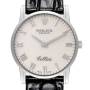 Replika Rolex Cellini Classic Weißgold Elfenbein Jubiläumszifferblatt Herrenuhr 5116. Handaufzugswerk. 18 Karat Weißgold schlankes Gehäuse mit 32,0 mm Durchmesser und 5,5 mm Dicke. Rolex-Logo auf der Krone. Kratzfestes Saphirglas. Flaches Profil. Elfenbein Jubiläumszifferblatt mit Weißgold römischen Ziffernindexen und Zeigern. Äußere Stabminutenmarkierungen. Maßgefertigtes schwarzes Lederarmband mit Rolex 18 Karat Weißgold Dornschließe.