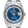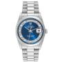 Zifferblatt: Blaues Myriaden-Diamant-Zifferblatt mit originalen Rolex-Werks-Diamant-Stundenmarkierungen. Zentralsekundenzeiger. Äußere Minuten- und 1/2-Sekunden-Teilung, Fenster für den Wochentag bei 12 Uhr, Fenster für das Datum bei 3 Uhr.