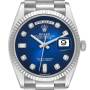 Zifferblatt: Blaues Ombré-Vignetten-Zifferblatt mit originalen Rolex-Werksdiamant-Stundenmarkierungen und Weißgold-Baton-Zeigern mit zentralem Sekundenzeiger. Wochentagsanzeige bei 12 Uhr. Datumskalender bei der 3-Uhr-Öffnung.
