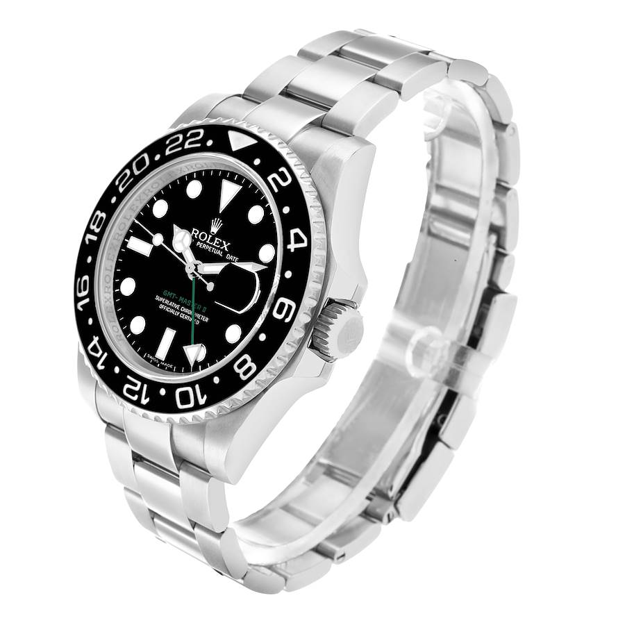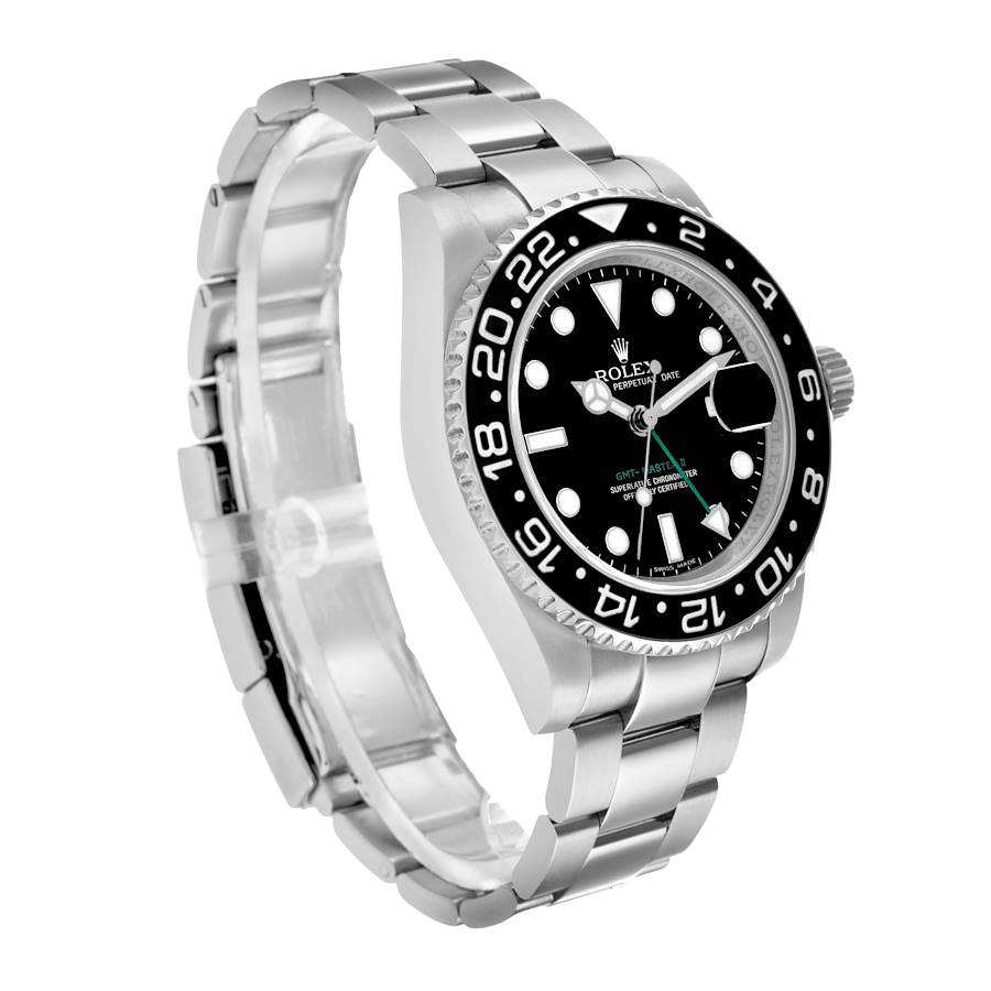 Replica Rolex GMT Master II Grünzeiger Schwarzes Zifferblatt Stahl Herrenuhr 116710. Offiziell zertifizierte Chronometer-Automatik-Uhrwerk mit GMT-Funktion. Hochleistungs-Paraflex-Stoßdämpfer. Bidirektionale Automatik über Perpetual-Rotor. Edelstahl-Oyster-Gehäuse mit 40,0 mm Durchmesser. Spitze Krallenschützer. Rolex-Logo auf der Krone. Edelstahl bidirektional drehbarer 24-Stunden-Lünette mit schwarzem Cerachrom-Keramikeinsatz. Kratzfestes Saphirglas mit Zyklop-Vergrößerungslinse. Schwarzes Zifferblatt mit weißen leuchtenden Punkten als Stundenskalen und Mercedes-Zeigern. Grüner GMT-Pfeilzeiger. Leuchtender Sekundenzeiger mit Lollipop-Spitze. Äußere Strichminutenskalen. Datumsanzeige bei der 3-Uhr-Apertur. Edelstahl-Oyster-Armband mit Flip-Lock-Verschluss und Easylink-Feinjustierung. Passt auf ein 7 3/4" Handgelenk.