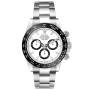 Zifferblatt: Weißes Panda-Zifferblatt mit leuchtenden Stundeneinlagen und Zeigern. Drei schwarz umrandete Hilfszifferblätter – Sekundenzeiger und die 30-Minuten- und 12-Stunden-Chronographenregister. Äußere Minuten- und 1/5-Sekunden-Strichmarkierungen.