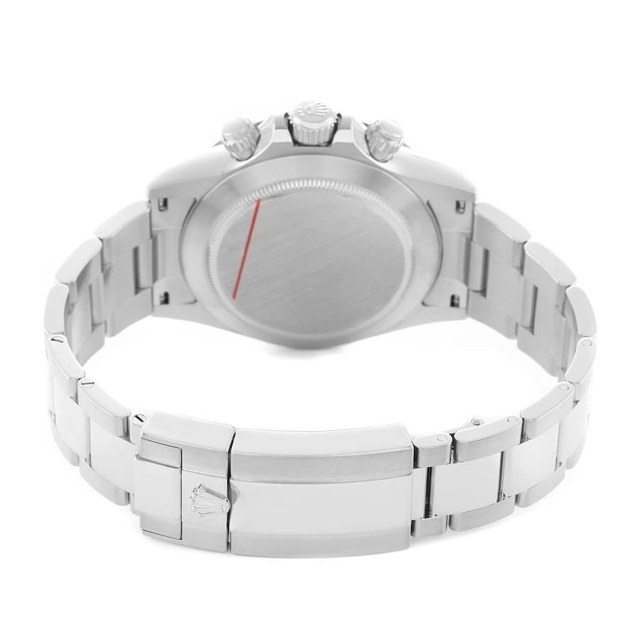 Gehause: Oyster-Gehause aus Edelstahl mit 40,0 mm Durchmesser. Zwei verschraubte Drucker bedienen die Chronographenfunktion. Spitz zulaufende Kronenschutzhorner. Rolex-Logo auf der Krone.