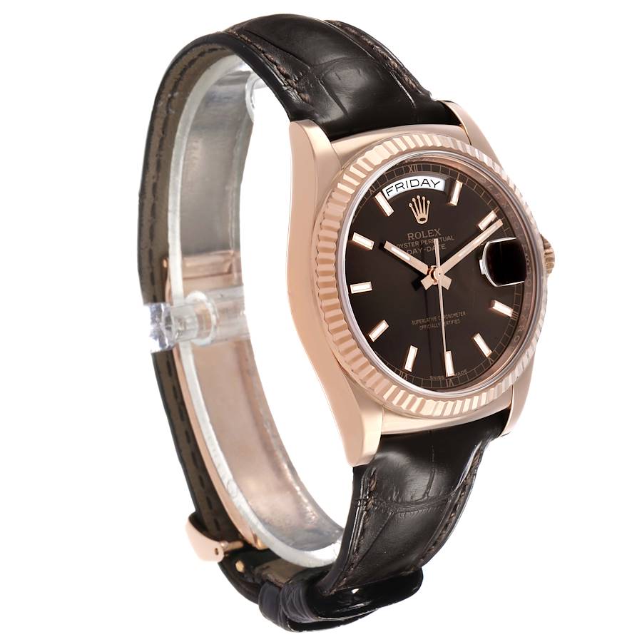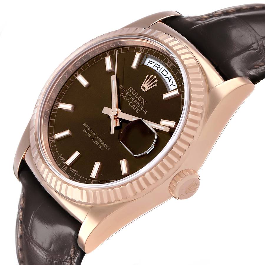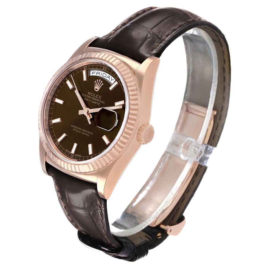 Replica Rolex President Day-Date Rose Gold Chocolate Dial Herren Uhr 118135. Offiziell zertifiziertes Chronometer mit automatischem Selbstaufzugswerk. 18k Rosagold Oyster Gehaeuse mit 36,0 mm Durchmesser. Rolex Logo auf der Krone. 18k Rosagold geriffelte Luenette. Kratzfestes Saphirglas mit Zyklop Lupe. Schokoladenfarbenes Zifferblatt mit leuchtenden Rosagold Stab Stundenmarkierungen und Zeigern. Zentrale Sweep Sekundenanzeige. Aeussere Minuten Skala. Wochentagsanzeige bei 12 Uhr. Datumsanzeige bei 3 Uhr. Braunes Alligatorlederarmband mit 18k Rosagold Faltschliesse.